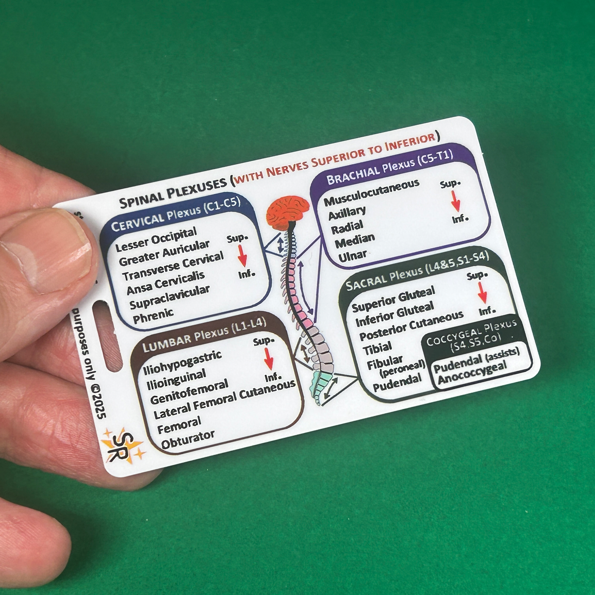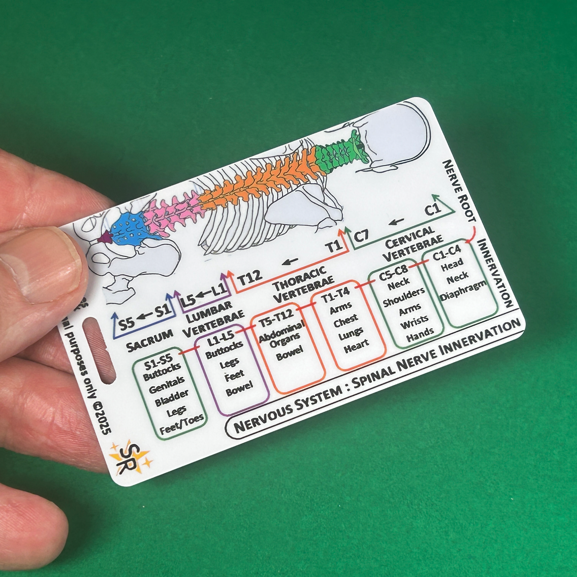 Stay ready with our Spinal Plexus and Nerve Innervation ID Badge Flashcard, designed to provide healthcare professionals and students with quick access to crucial neuroanatomical details. Whether you're a medical student, nurse, physiotherapist, paramedic, ECA, or first responder, this card is an essential tool for patient care and assessment.