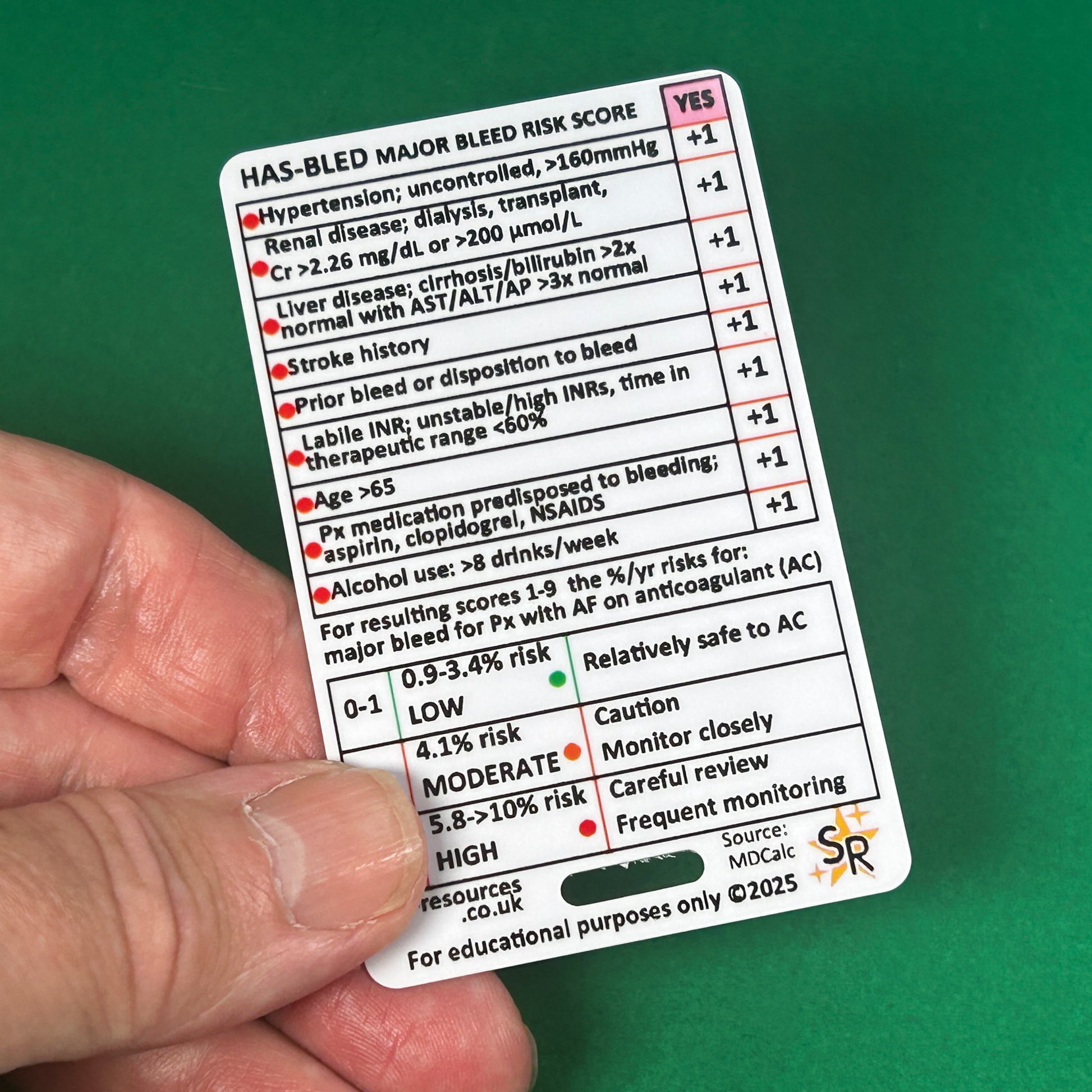 Keep the HAS-BLED and CHADS-VASc scores right at your fingertips. Designed for quick reference, this laminated, durable card helps you evaluate stroke and major bleeding risk safely and efficiently. Ideal for students and professionals in the field or classroom.