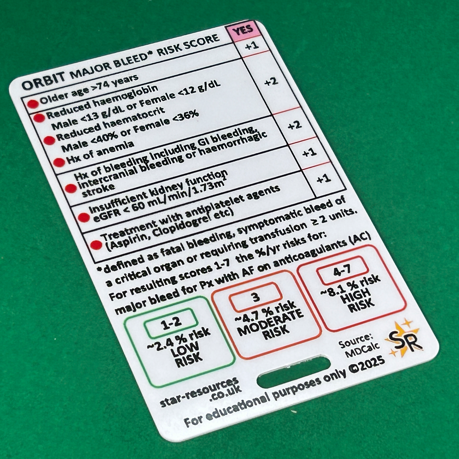 • ORBIT – Another validated tool for bleeding risk, especially for patients in AF on oral anticoagulants.