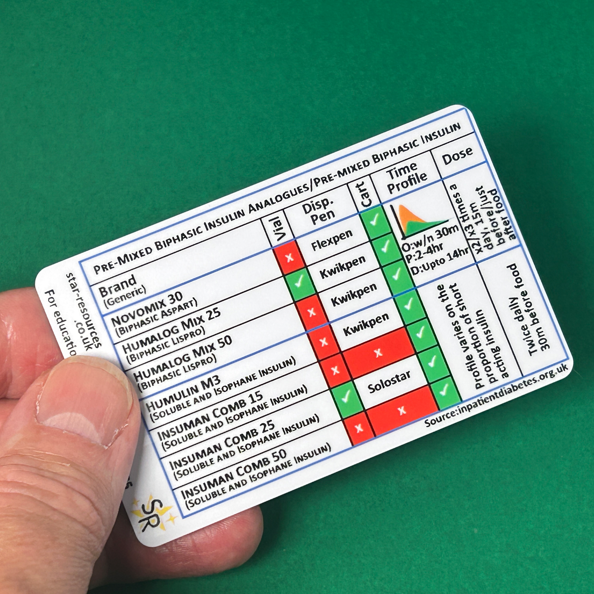 Perfectly sized to clip onto your badge, this double-sided flash card breaks down the insulins you actually use in clinical practice—covering types, onset, peak, duration, and usage. Ideal for busy hands and fast-paced wards.