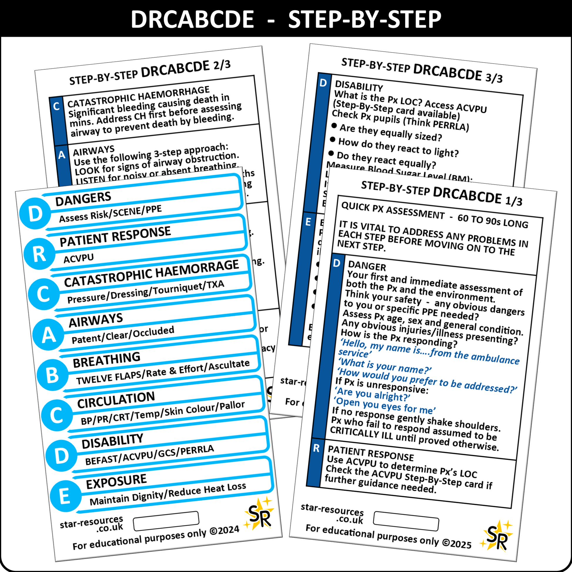 The DRCABCDE Step-by-step Flashcard is an essential tool for paramedics, nurses, and healthcare professionals. Whether you’re in training or experienced in the field, this card helps you maintain focus and accuracy during emergency patient assessments, following the proven DRCABCDE approach.
