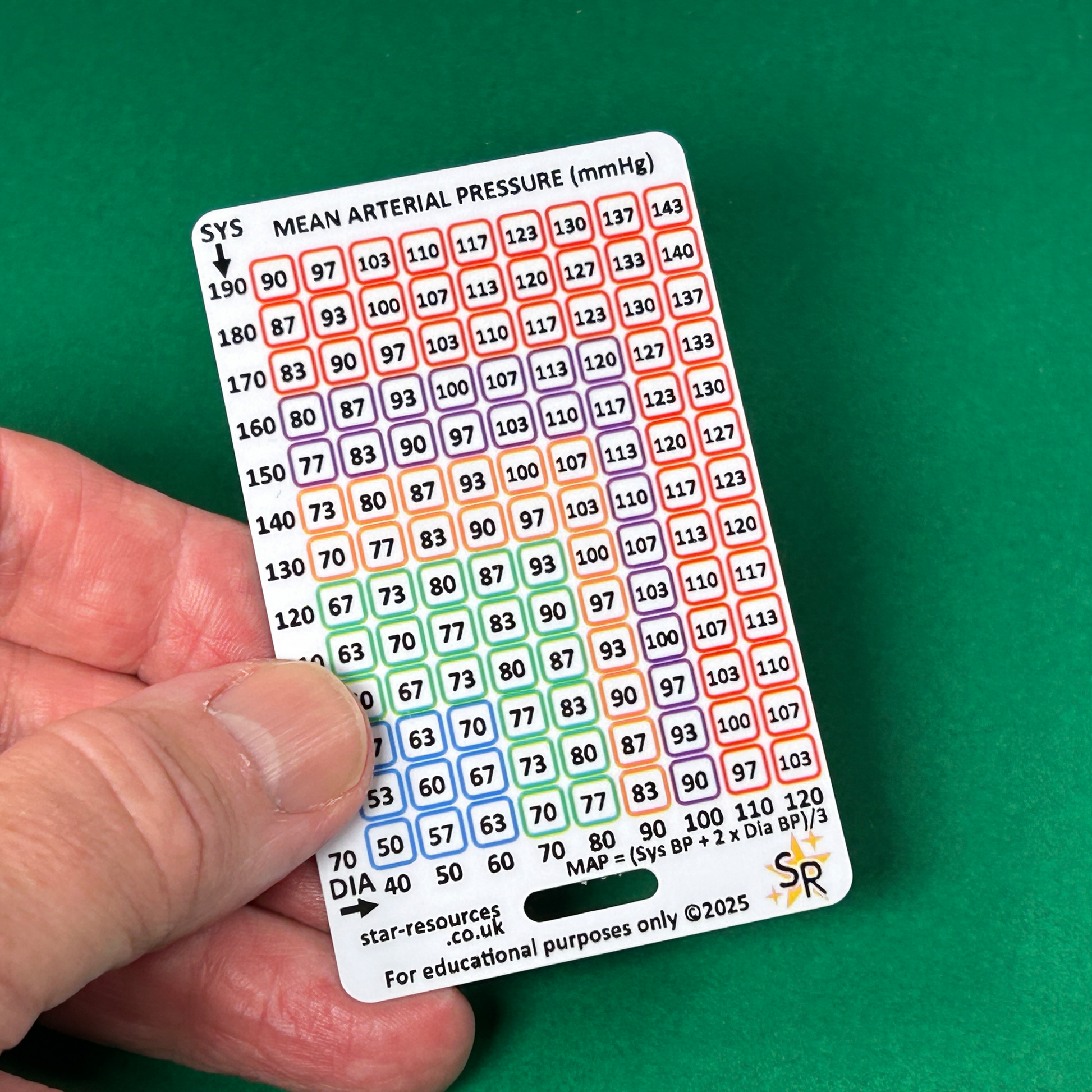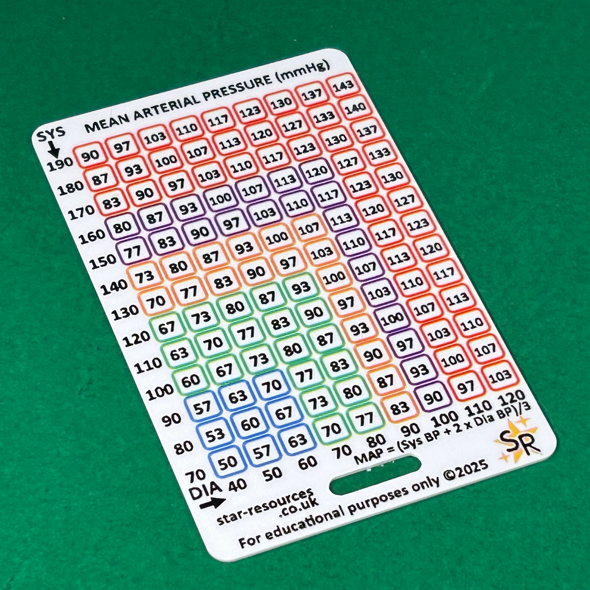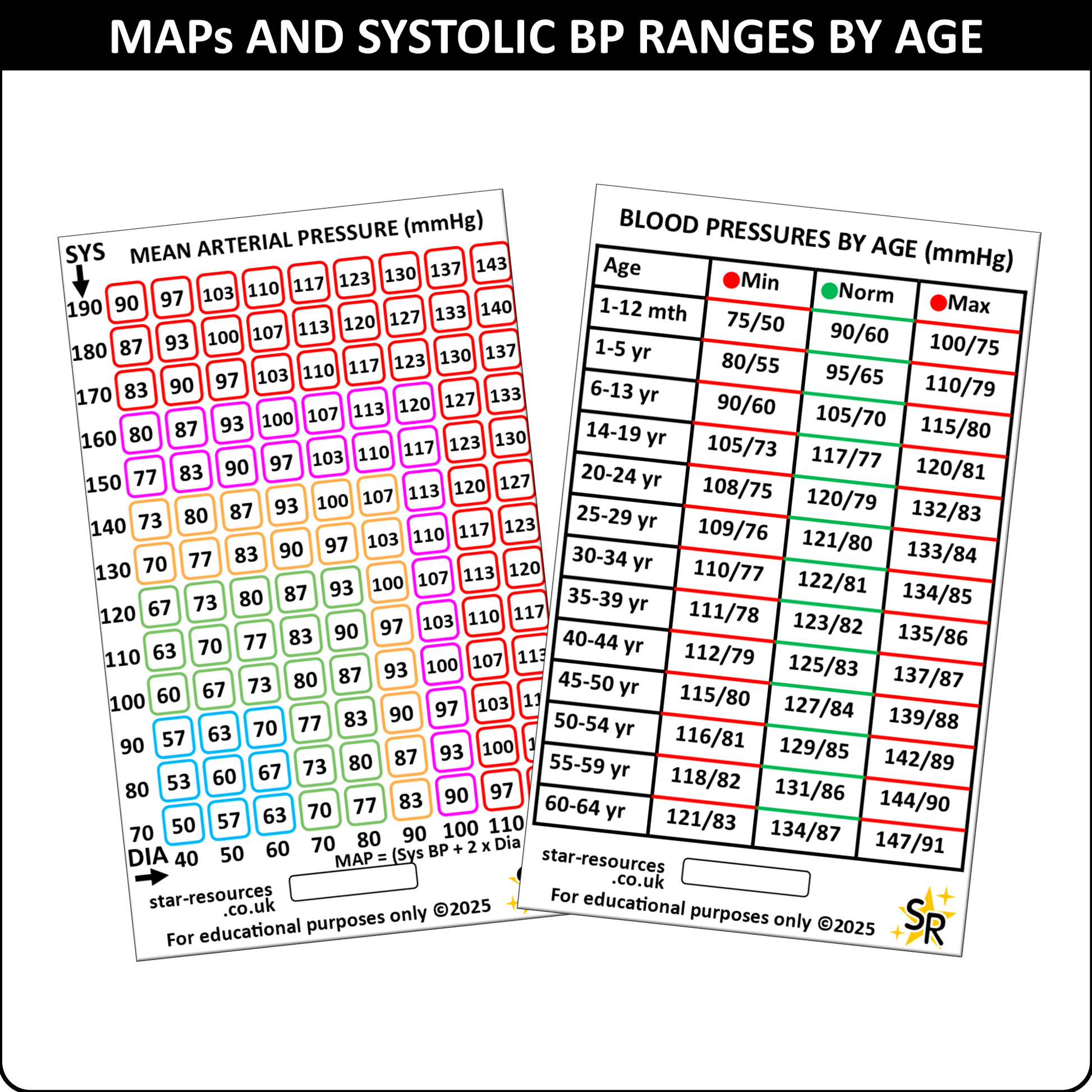 Front: Quick-reference MAP (Mean Arterial Pressure) chart