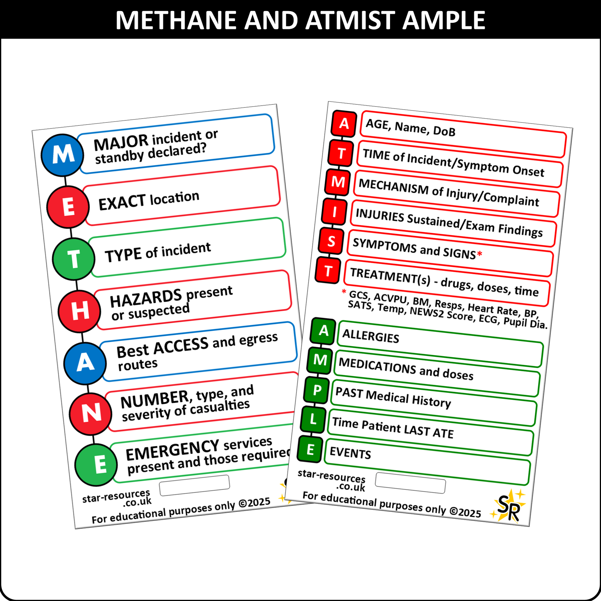 As a healthcare professional, you understand the importance of rapid and accurate patient assessments. In emergency situations, every second counts, and having the right tools at your fingertips can make all the difference. That’s why we’re excited to introduce our Methane and ATMIST-AMPLE Flash Card—a compact, essential reference designed to elevate your clinical practice.