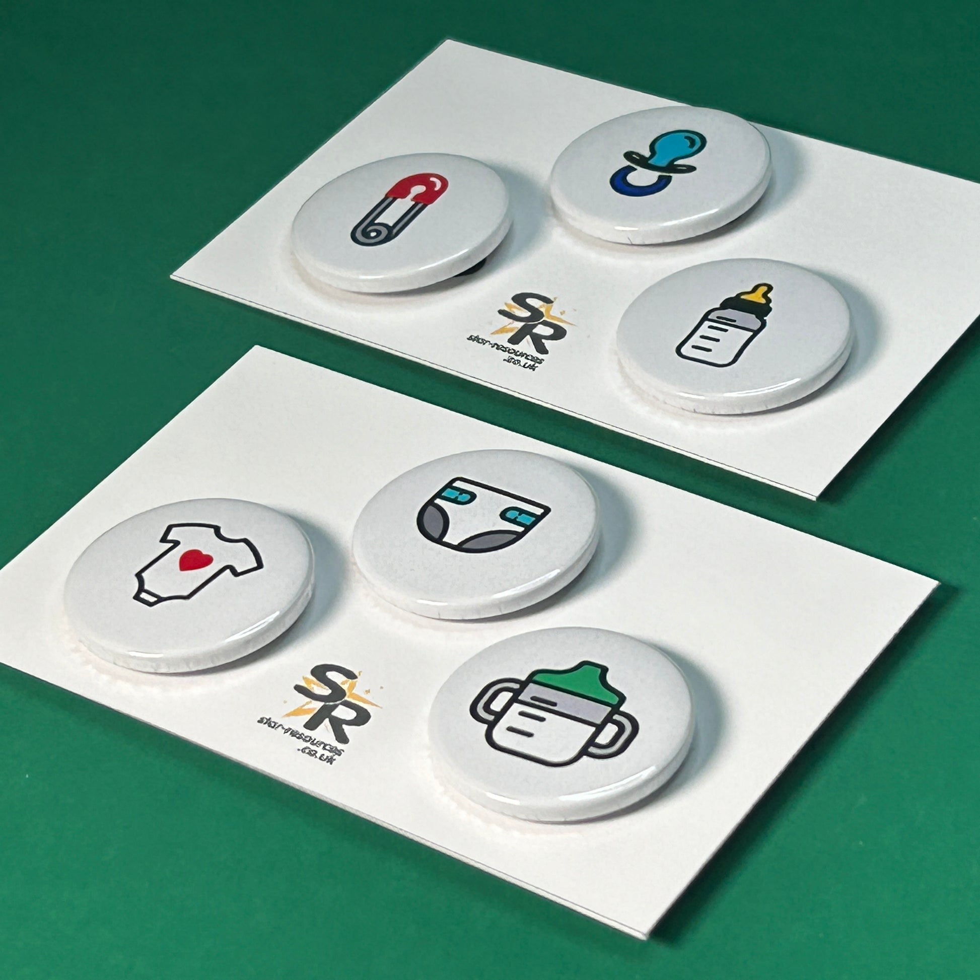 * Baby icons (set 3) - onesie / nappy / sippy cup / safety pin / dummy / feeding bottle - set of 6 badges