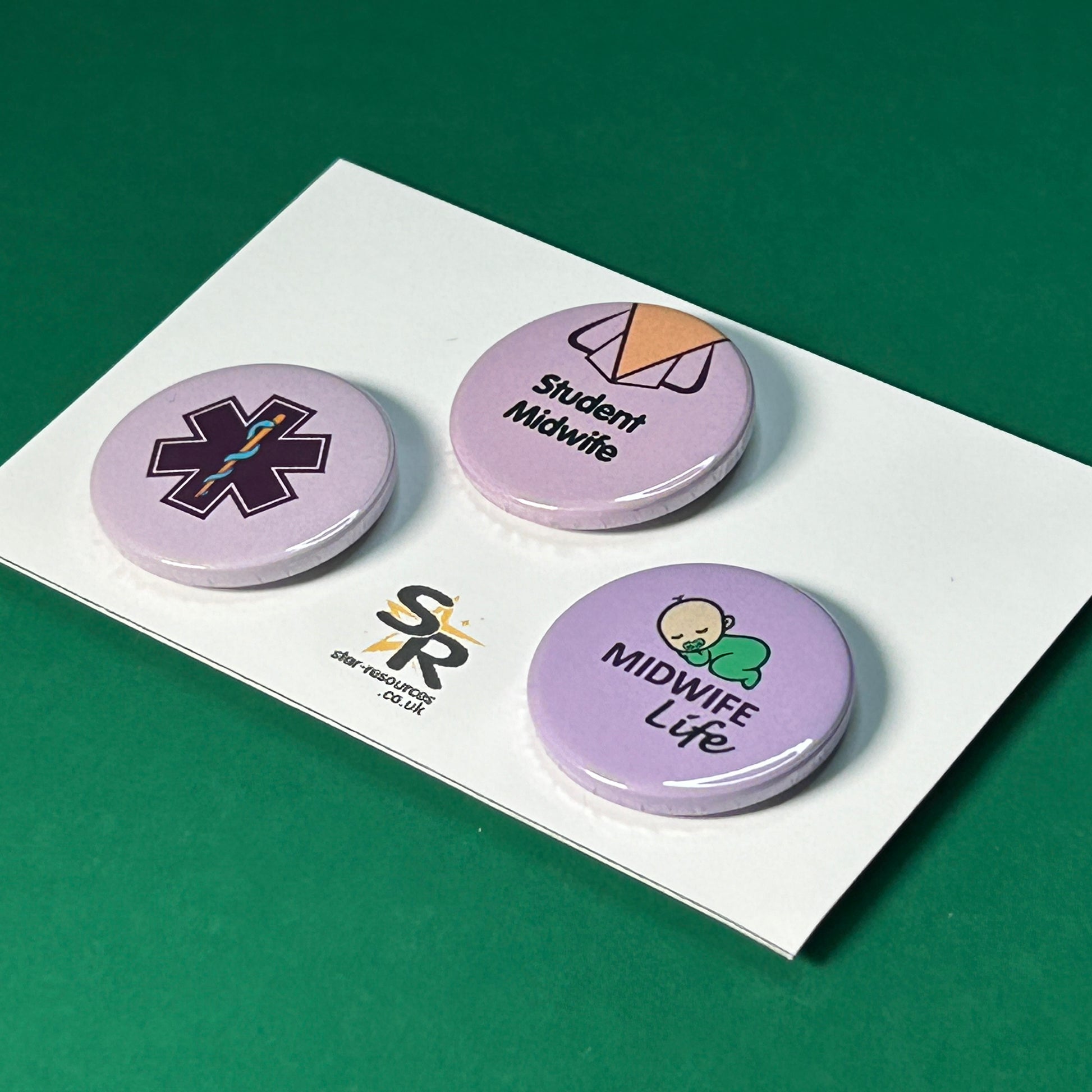 * Student Midwife (pink uniform) / pink and mauve Cadacus / Midwife Life green baby - set of 3 badges
