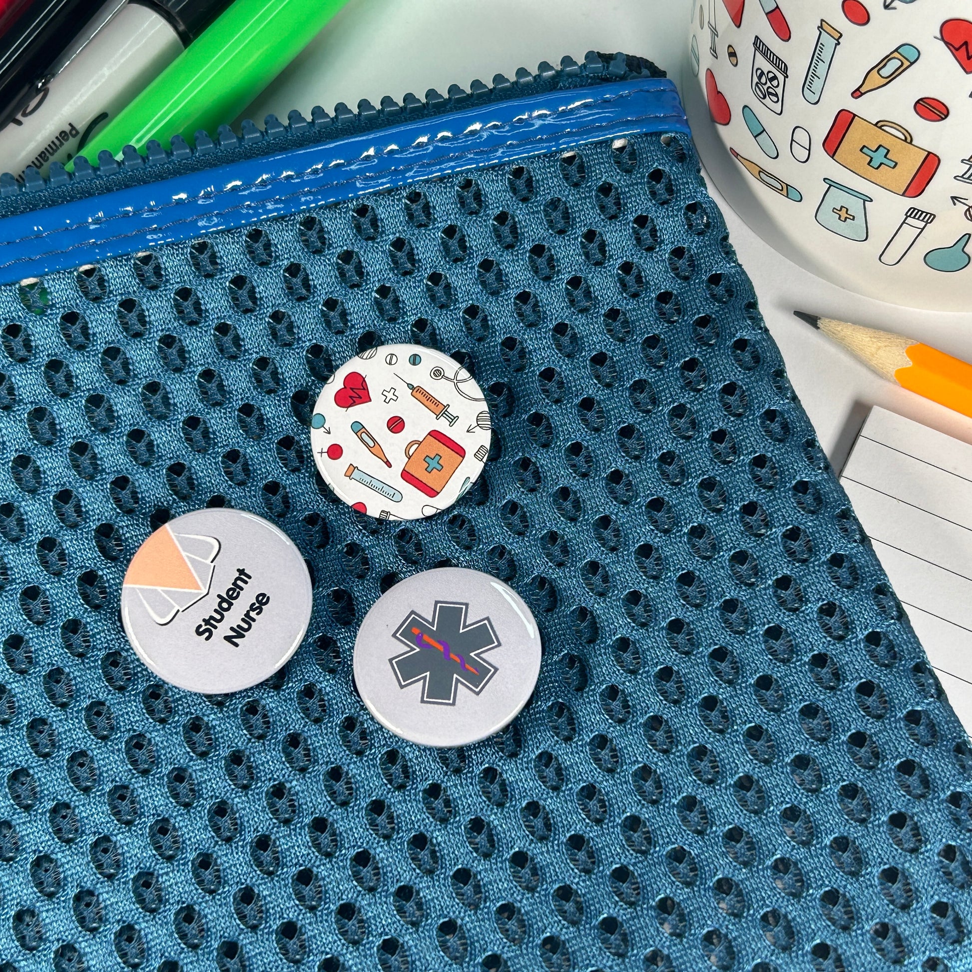 Fun 25mm badges aimed at nurses and student nurses - especially designed for work bags, back packs, coats, pencil cases etc.