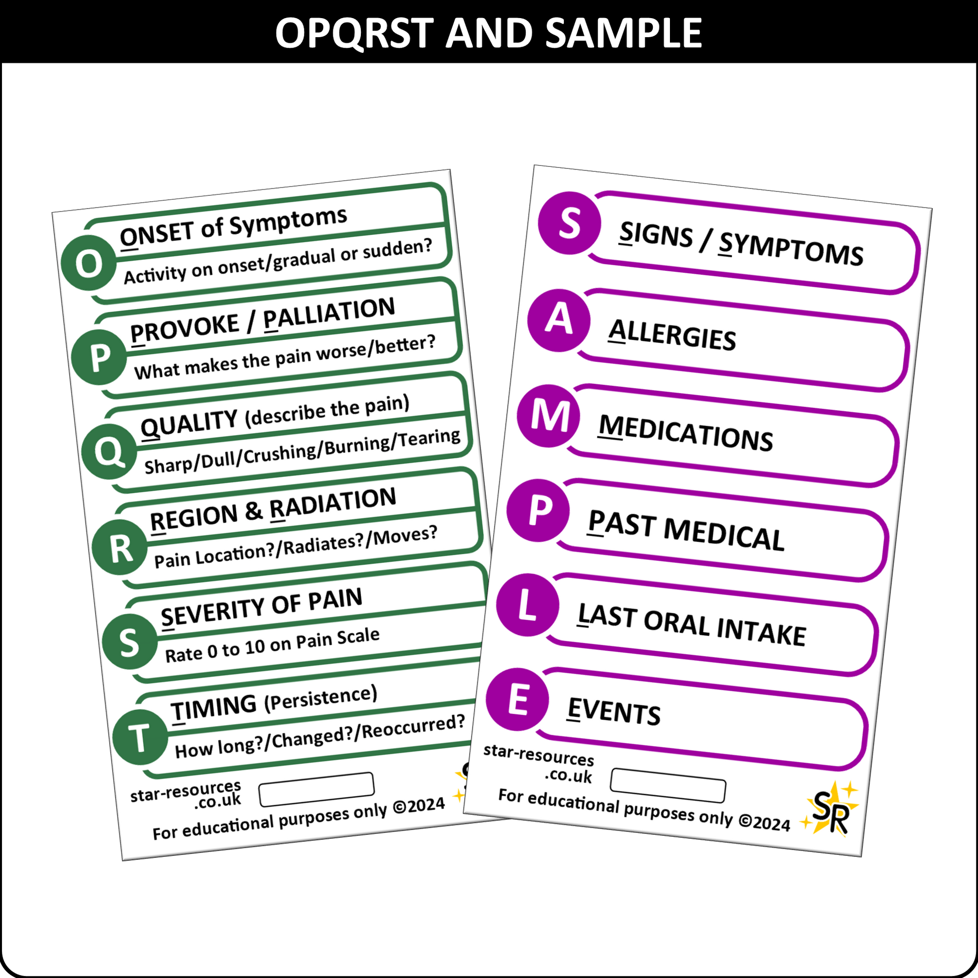 - Comprehensive OPQRST and SAMPLE mnemonics for efficient patient assessment.