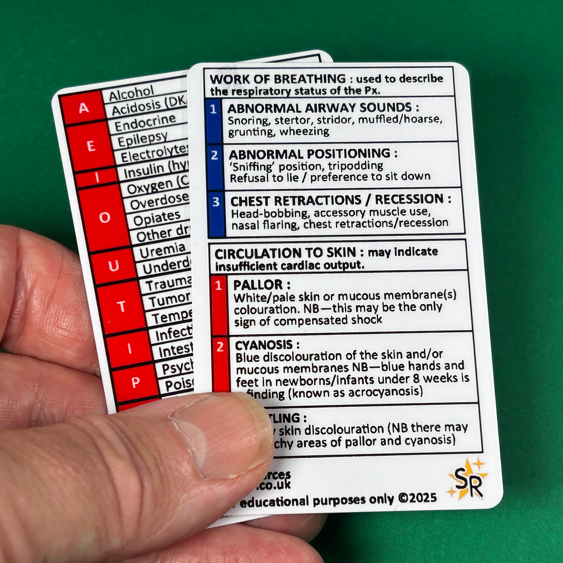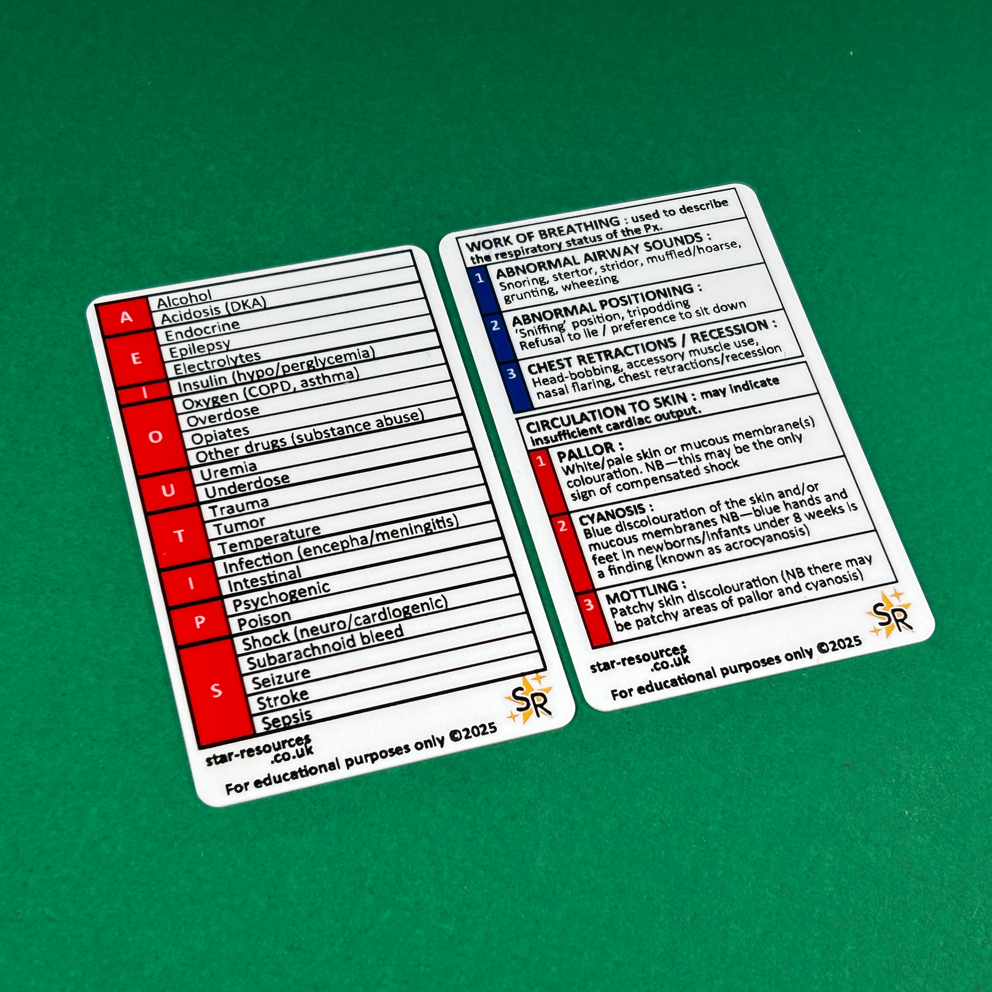 Master pediatric emergencies with this step-by-step, double-sided flashcard set—perfect for quick reference when every second matters. Clear, durable, and pocket-sized, these cards guide you through the Pediatric Assessment Triangle (PAT) and the AEIOUTIPS mnemonic for altered mental state.