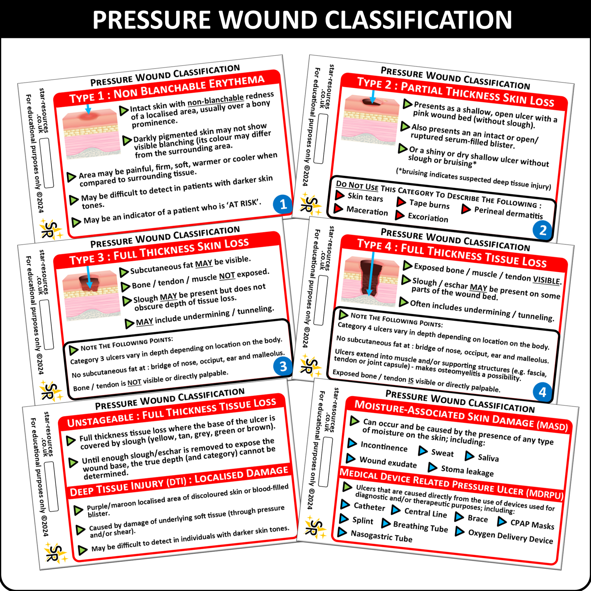 Quick Reference On-Demand: Covers all major pressure wounds: Types 1-4, plus Unstageable wounds, Deep Tissue Injuries, Moisture-Associated Skin Damage, and Medical Device Related Pressure Ulcers. Use them to refresh your understanding in seconds.