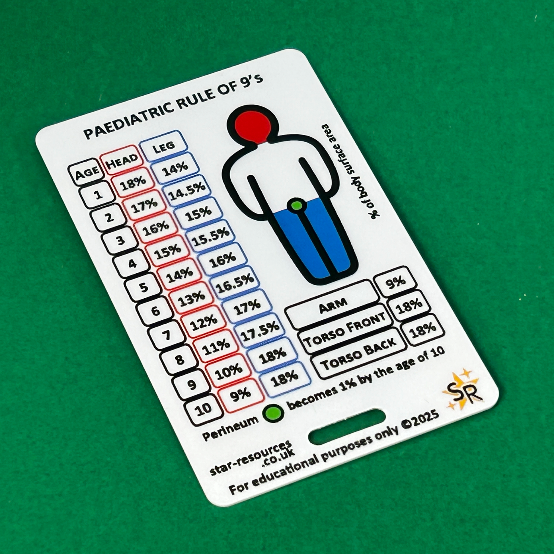 Quick, reliable burns assessment is critical in emergency care. The Rule of Nines ID Badge provides a fast, easy-to-reference visual guide to estimate total body surface area (TBSA) affected by burns in both adults and children.