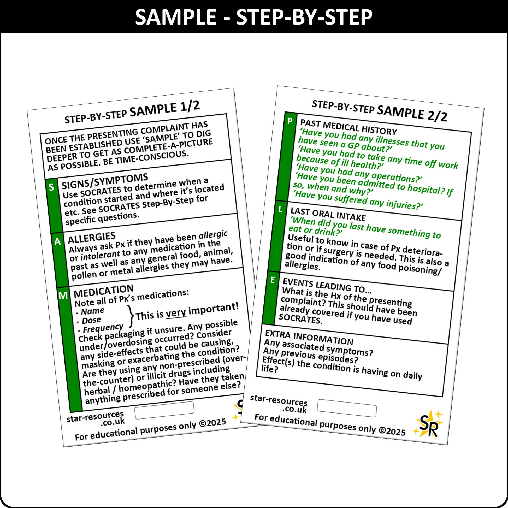 This SAMPLE Step-by-step Flashcard is a must-have for healthcare professionals and students alike. Whether you're just starting out or need a reliable, fast-reference guide, this card simplifies patient history-taking with easy prompts and example questions. It’s ideal for paramedics, nurses, and ECAs who work in high-pressure environments and need a quick, reliable tool to aid in patient assessment.