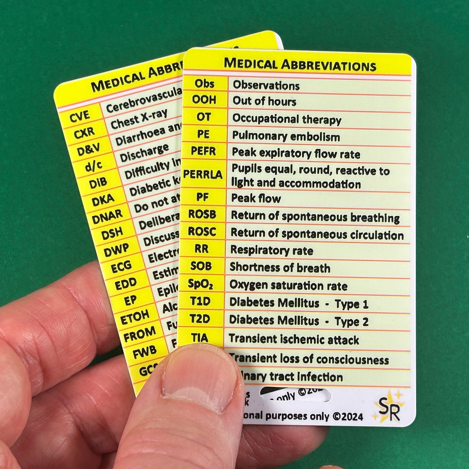 Medical Abbreviations (x2 cards) — common terms you’ll see on notes and charts, with reminders for safe usage.